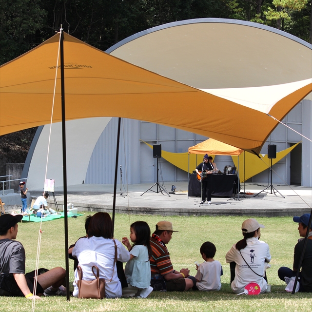 野外演舞場前に広がる芝生スペースにはタープを設置。